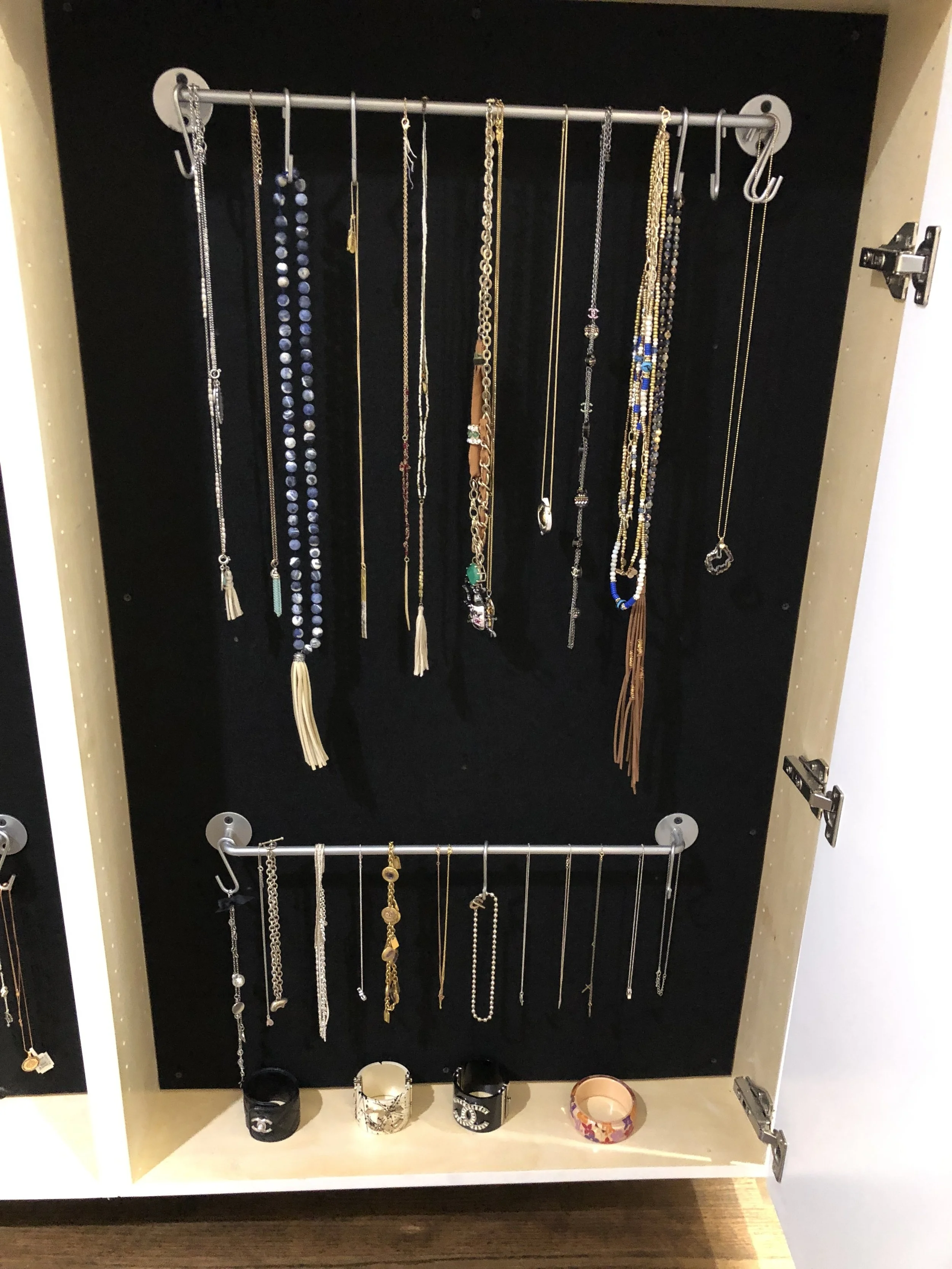 Statement necklaces are hard to keep organized laying down in a drawer. Storing them on an IKEA rod organizer with hooks is a great solution.